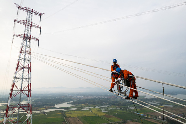 9月18日,在位于湖南省岳陽市臨湘市的南荊長特高壓工程螺山長江大跨越施工現場,國網山東送變電工程有限公司的工作人員調整間隔棒(無人機照片)。新華社記者 陳思汗 攝