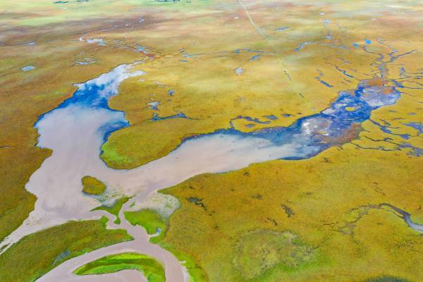 這是瑪曲縣阿萬倉濕地內的一處沼澤(9月17日攝,無人機照片)。