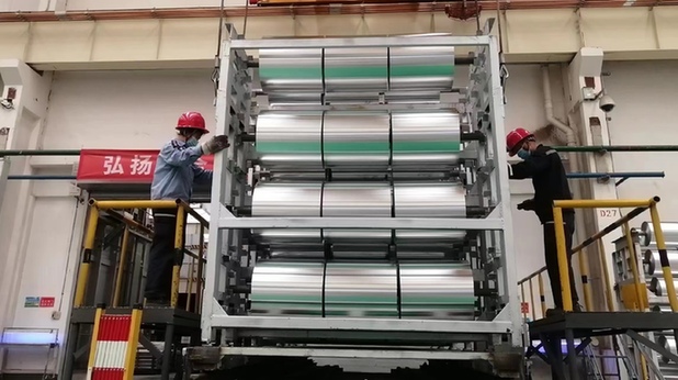 金秋時節,在隴西鋁箔的車間里,生產場面火熱:巨龍般的機器將鋁材不斷傳送過來,展平輥像搟面杖一樣,將鋁材“搟”薄。經過軋制、精整、退火等工序,原本厚230至280微米的鋁材最終“瘦身”成4.5至6微米薄厚的高端鋁箔。