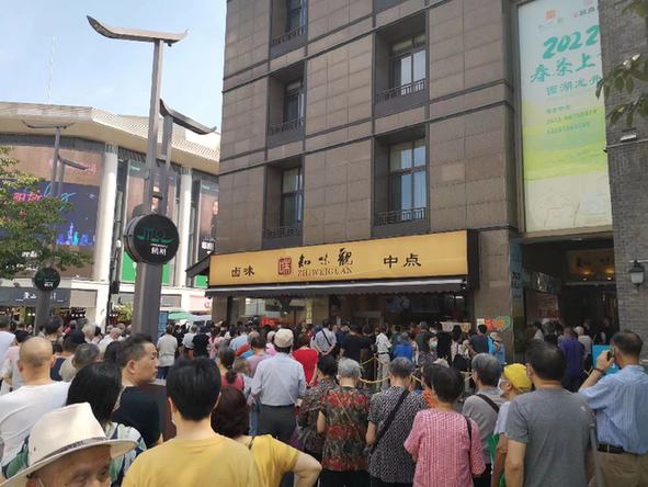 消費者在排隊購買知味觀的鹵味熟食和點心糕點等產品。(受訪者供圖)