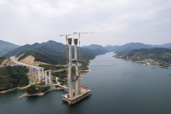 當日,官(莊)新(化)高速全線重點控制性工程馬路口資水特大橋主墩封頂,即將進入橋梁上構施工階段,為早日通車運行奠定了基礎。馬路口資水特大橋位于湖南省益陽市安化縣柘溪水庫內,全長1187米,主跨500米,其中水中主塔高202.4米。