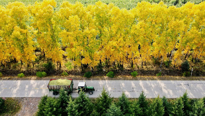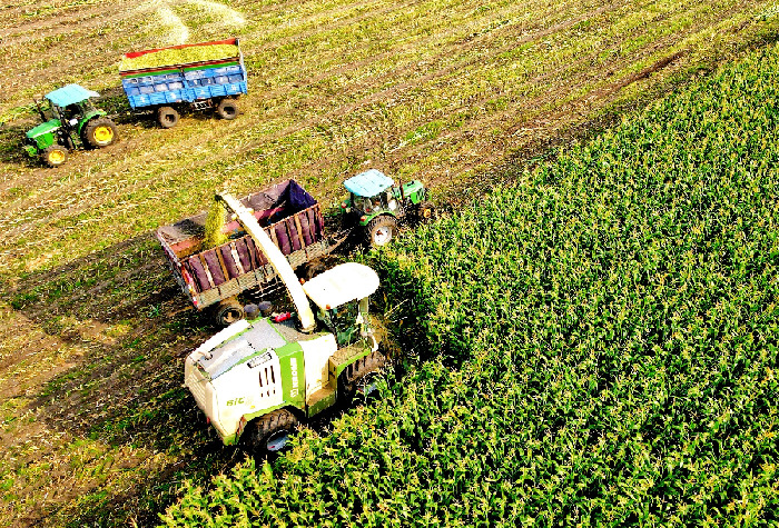 北大荒集團北安分公司趙光農場有限公司的青貯玉米已經迎來收獲,拉開了當地旱田收獲序幕。一輛輛收獲機車前進著將整片玉米“吃”進去,連秸稈帶玉米棒一起粉碎后再“吐”出來,旁邊的運輸車輛緊緊跟隨,一車裝滿后,新鮮的青貯玉米被直接運往養殖場入窖壓實儲藏。