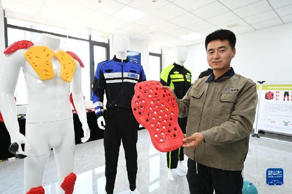 在位于秦創原總窗口所在地陜西省西咸新區的陜西拓銳考新材料科技有限公司,工作人員展示自主研發的納米智能吸能慢回彈護具(2022年6月17日攝)。新華社記者 李一博 攝