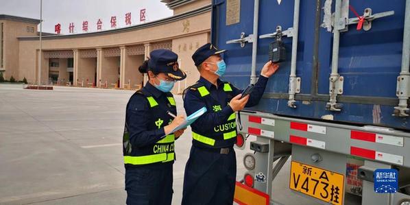 海關現場關員在喀什綜合保稅區登記入區車輛電子鎖信息(2022年9月14日攝)。新華社發(圖爾罕·麥麥提伊敏 攝)