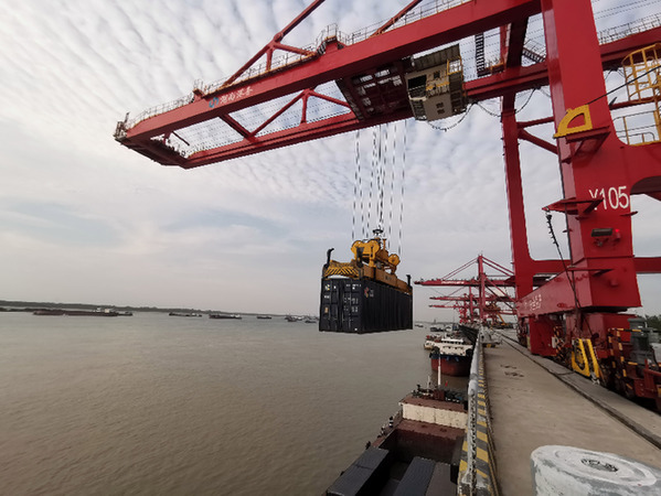 湖南城陵磯國際集裝箱港的集裝箱裝卸現場。記者 周楠 攝