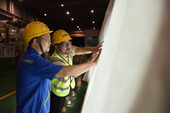 岳陽林紙股份有限公司出口拓展部部長王子剛(右一)在車間查看產品。記者 白田田 攝