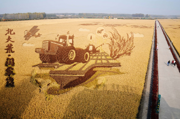 人們在北大荒集團閆家崗農場有限公司農業現代化示范區的稻田畫旁游玩。新華社記者 王建威 攝