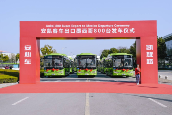2022年3月,“800輛安凱客車出口墨西哥發車儀式”在安徽安凱客車廠區舉行。800輛10.5米安凱天然氣公交車的載夢遠航,為美洲及全球的低碳發展傳遞“綠色能量”,同時也為中國客車出口帶來了強勁的增長動能。