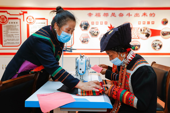 10月27日,在四川省涼山州昭覺縣南坪社區的彝繡工坊,易地扶貧搬遷到此的婦女在交流彝繡技藝。這個彝繡工坊有100多名繡娘,依照訂單制作彝族傳統服飾制品,繡娘們在此靈活就業,既能為家庭增收,又方便照顧家中老人和孩子,每年可增收數千至上萬元。