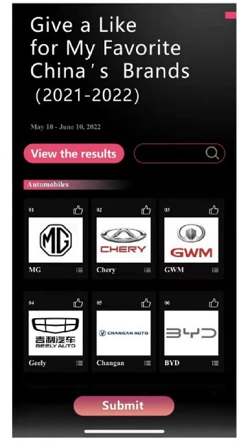 為展示中國品牌在國內國際雙循環相互促進的新發展格局下的全球化競爭力,新華社民族品牌工程辦公室、中國經濟信息社聯合多家機構從2022年3月起共同推出了“2022外國人喜愛的中國品牌”征集活動?;顒油ㄟ^參考主流媒體、行業協會、電商平臺、企業信息平臺、企業官網信息及《財富》雜志世界500強、中國500強等各類數據,遴選出涵蓋汽車、家電、醫藥、酒類、食品飲料、化妝品、服飾鞋帽、電子消費品、金融、交通物流、網絡服務等11類、共137個品牌的初選名單,并于5月10日起面對海外消費者開啟網絡投票。