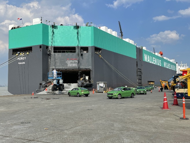 天津華圖汽車物流有限公司一批二手新能源車從連云港裝船發往阿聯酋迪拜。(采訪對象供圖)