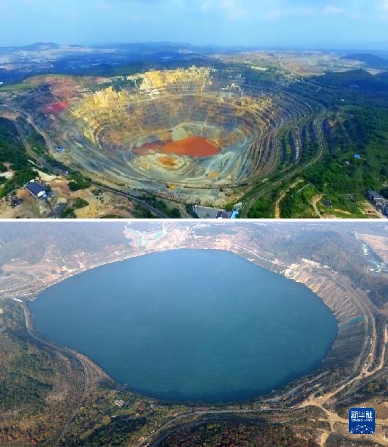 拼版照片:上圖為開采中的安徽省馬鞍山市雨山區向山鎮凹山采場(資料照片),下圖為生態修復后的凹山采場(新華社記者劉軍喜11月8日攝,無人機照片)。新華社發