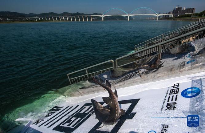 在湖北省宜昌市舉行的“2022年長江三峽中華鱘放流活動”現場,中華鱘從放流通道滑入長江(4月9日攝)。新華社發(鄭家裕 攝)