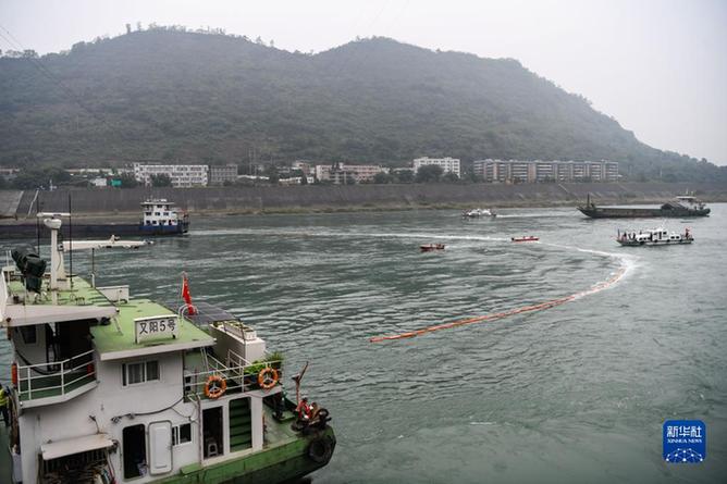 11月9日,在四川省宜賓市敘州區的長江流域突發生態環境事件應急綜合演練現場,多方部門協作在金沙江面布設圍油欄。新華社記者 王曦 攝