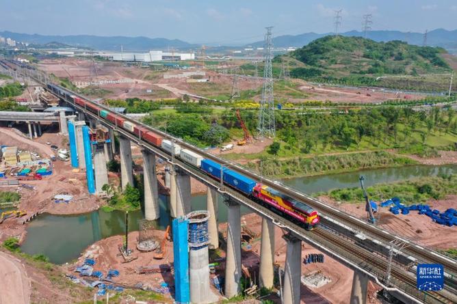 中緬新通道(重慶—臨滄—緬甸)國際鐵路班列從重慶果園港魚嘴車站順利發車(5月23日攝,無人機照片)。新華社記者 唐奕 攝