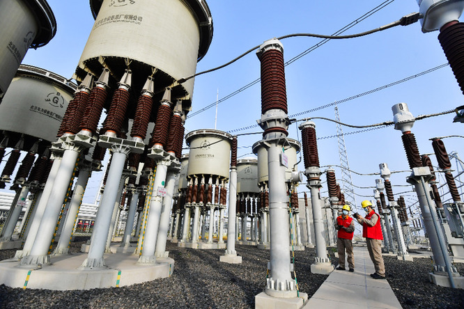 國網天津電力工作人員在1000千伏特高壓海河變電站內開展設備特巡檢查。(國網天津電力供圖)