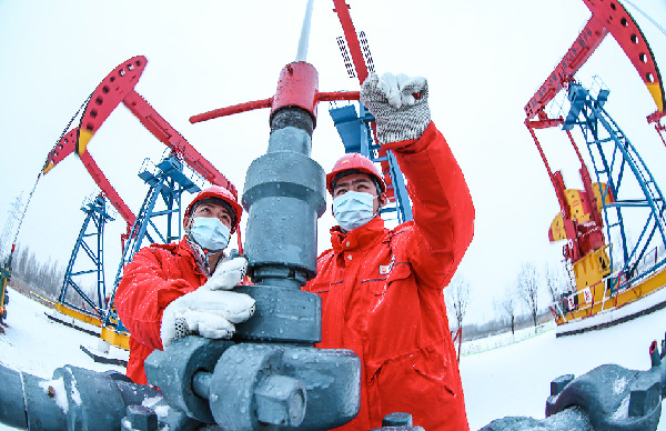 大慶油田第一采油廠員工在保障油井冬季安全生產。