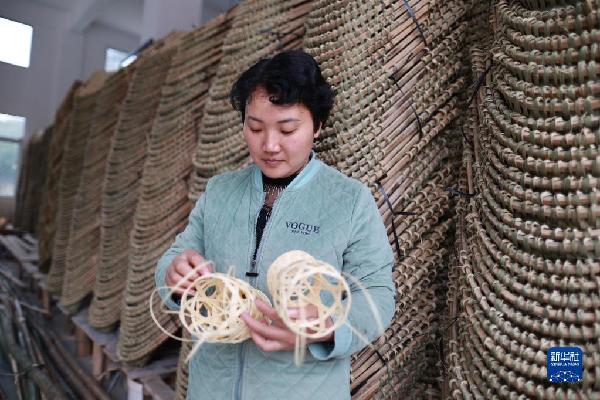 2022年11月29日,在貴州省赤水市竹城竹業加工坊,赤水竹編傳承人唐小容在編織竹制品。新華社記者 劉續 攝