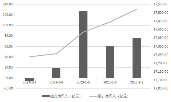 此前的1月5日,北向資金當日凈買入127.53億元,這也是自2022年12月1日以來,北向資金再度單日凈買入超百億。而據Wind統計,截至1月9日,2023年以來北向資金累計凈買入額已經達到了277億元。