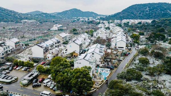樹山村媳婦曹莉莉過去從事跨境電商工作,2020年她與丈夫重新裝修自家老房、經營民宿?!坝[山·悅境”位于山腳下,昔日破舊的農房如今變身花園別墅,幾位住客坐在窗邊,曬太陽、品茶、欣賞山景。