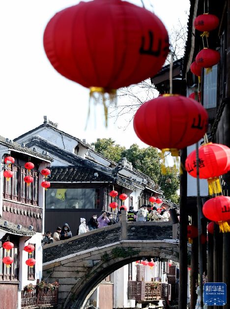 ↑1月27日,游客在江蘇省蘇州市山塘街觀光游覽。新華社發(杭興微 攝)