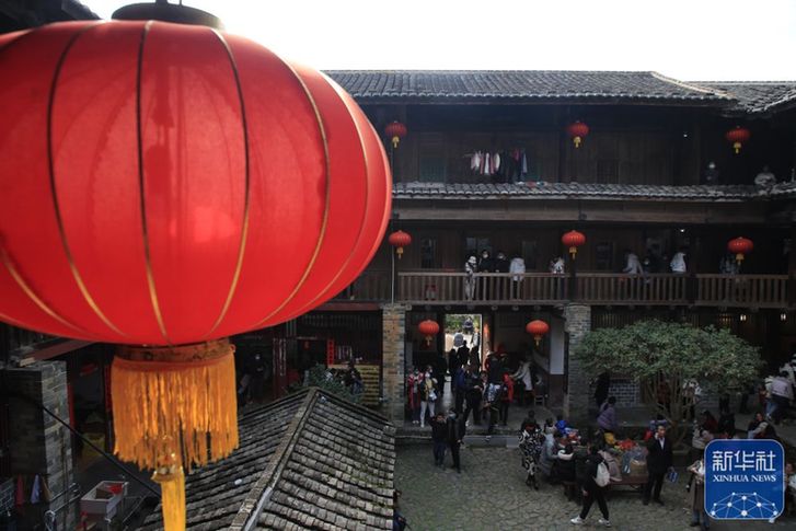 ↑1月25日,游客在福建省龍巖市永定區土樓景區游玩。新華社發(周楊東 攝)