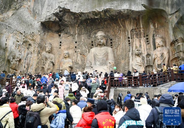 ↑1月26日,游客在河南省洛陽市龍門石窟景區內游覽。新華社發(張怡熙攝)