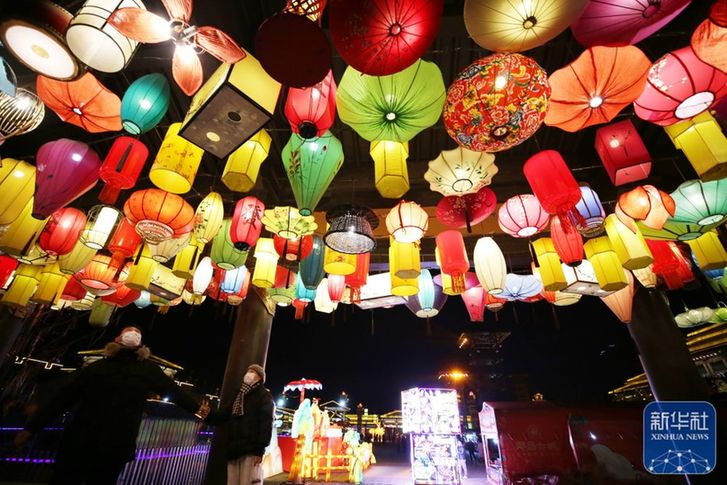 ↑1月27日晚,游客在山東省郯城縣郯國古城景區觀看花燈。新華社發(張春雷 攝)