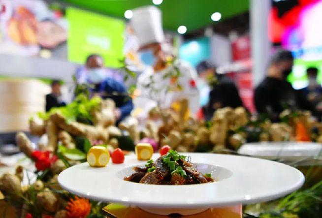 2021年12月2日,在2021中國預制菜產業大會暨展會現場,參展商展示一盤快熟菜品。新華社發