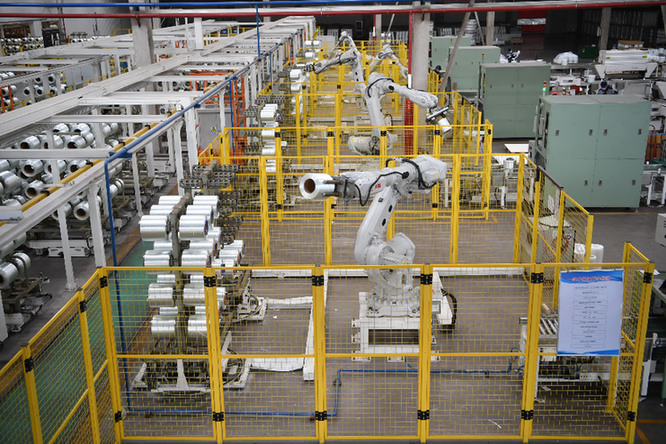 機械手臂在沙河市一家玻璃制品生產企業的生產線上工作。 新華社記者 牟宇 攝