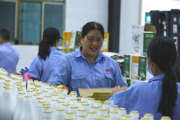 工人在椰汁飲品生產線上忙碌。(黎多江 攝)