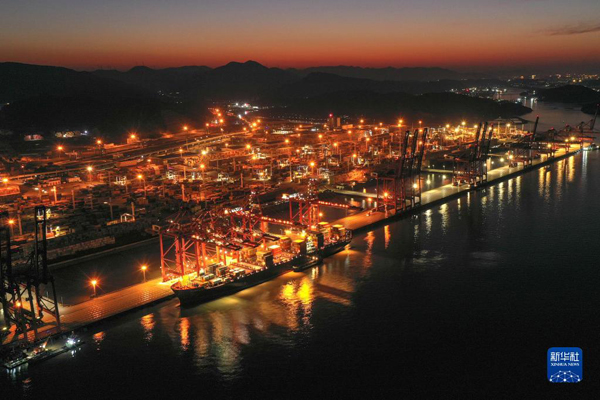 夜幕下,一艘貨輪??吭趯幉ㄖ凵礁鄞┥礁蹍^集裝箱碼頭(2023年1月31日攝,無人機照片)。2022年寧波舟山港完成年貨物吞吐量超12.5億噸,連續14年位居全球第一;完成集裝箱吞吐量3335萬標準箱,位居全球第三。新華社記者 黃宗治 攝