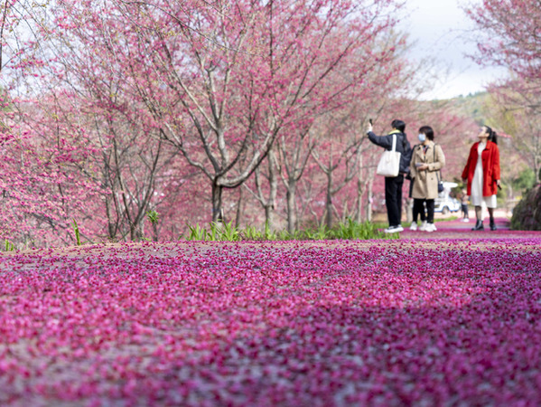 2月12日,游客在福建省南靖土樓景區的紫云山生態園拍照賞櫻。