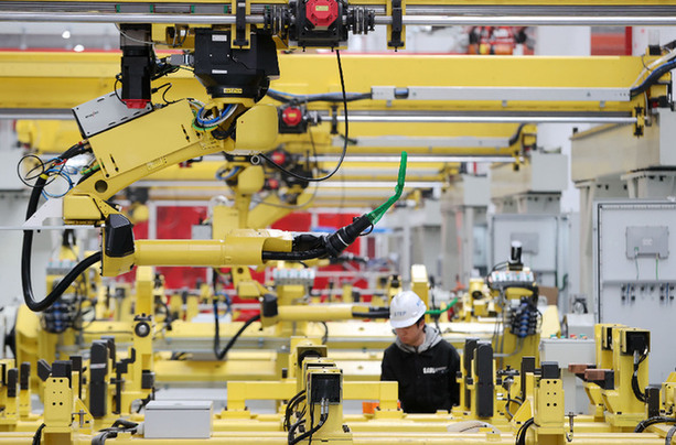 2月12日,德清縣雷甸鎮一家高空作業機械生產企業“未來工廠”車間,工人在調試智能化生產線。