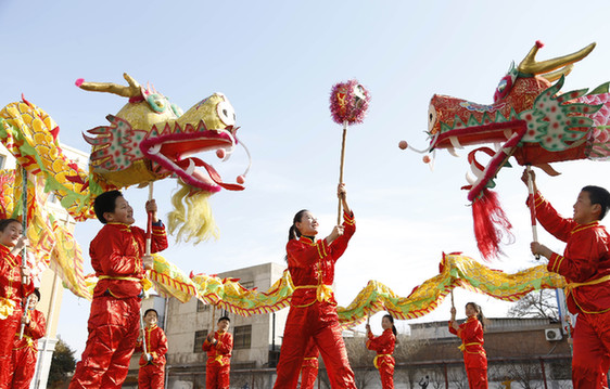 2月21日,河北省邢臺市東牛角小學學生在表演舞龍。
