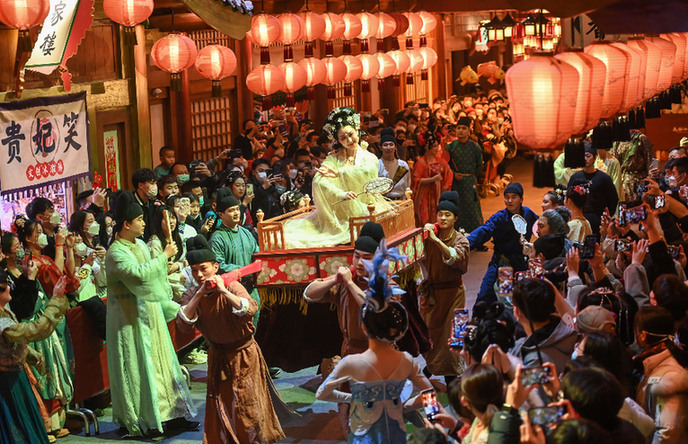 長安十二時辰唐文化主題街區里,來自西安歌舞劇院的演員們為來自全國各地的游客帶來唐文化主題演藝,提供沉浸式“穿越體驗”?!按汗澠陂g,我們每天演出時長近12個小時,客流高峰時接待游客超過6萬人。雖然很累,但看到游客欣賞我們的演出,聽到他們夸獎西安,就覺得辛苦都是值得的?!辟F妃的扮演者郭雪瑩說。