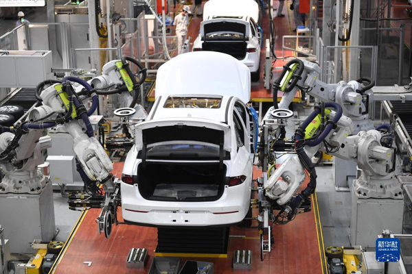 在廣州市番禺區的廣汽埃安新能源汽車股份有限公司總裝生產線,機器人手臂在安裝汽車輪胎(2023年2月24日攝)。新華社記者 鄧華 攝