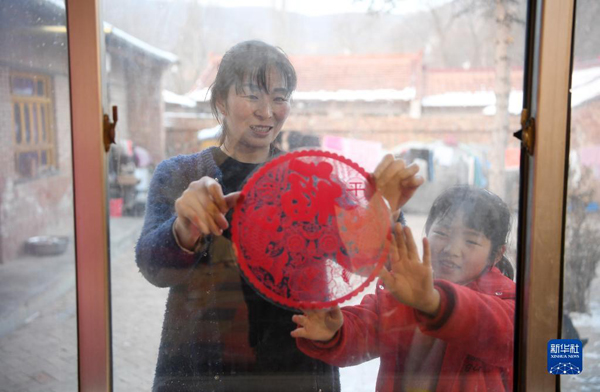 在位于大山深處的寧夏固原市隆德縣鳳嶺鄉于河村,村民馬鳳艷和女兒一起貼窗花(2022年1月28日攝)。近年來,在鄉村振興等戰略助力下,于河村村容村貌發生巨大變化。新華社記者 王鵬 攝