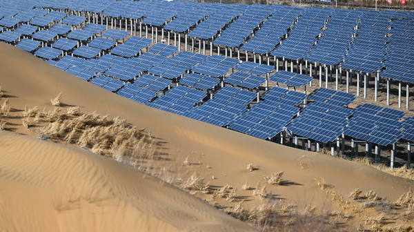在鄂爾多斯市達拉特旗昭君鎮柴磴嘎查,346萬塊藍色光伏板隨著綿延的庫布其沙漠起伏,像陣陣波濤,在漫漫沙海中匯成3000萬平方米的光伏“海洋”。走在3米高的光伏架下,達拉特旗委書記張秀玲高興地介紹:“這里種的是1.2萬畝紅棗,那邊是5000畝黃芪和黃芩,更遠處是1.9萬畝的優質牧草。沙窩里種上作物,再從上面架起光伏板,相當于打了兩層‘保護傘’,黃沙休想亂跑?!?/p>