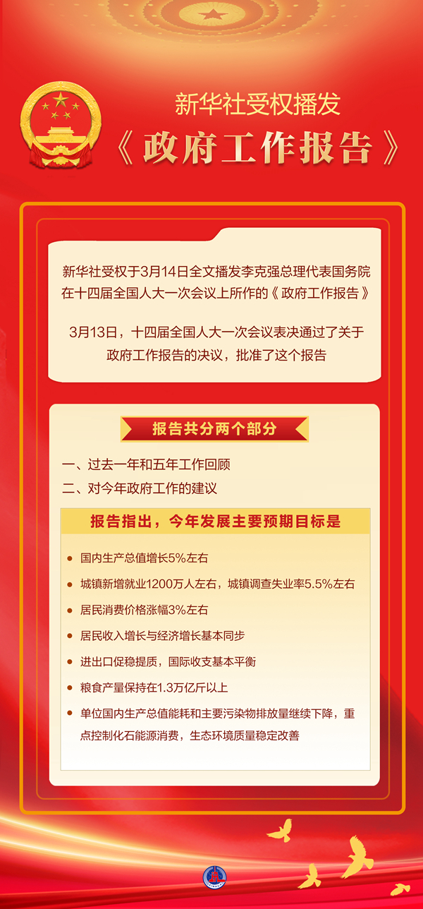 報告指出,今年發展主要預期目標是:國內生產總值增長5%左右;城鎮新增就業1200萬人左右,城鎮調查失業率5.5%左右;居民消費價格漲幅3%左右;居民收入增長與經濟增長基本同步;進出口促穩提質,國際收支基本平衡;糧食產量保持在1.3萬億斤以上;單位國內生產總值能耗和主要污染物排放量繼續下降,重點控制化石能源消費,生態環境質量穩定改善。