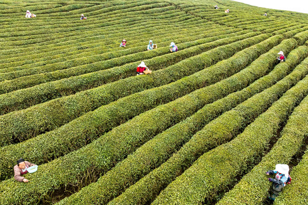 3月15日,茶農在貴州省安順市西秀區雙堡鎮一茶園采摘春茶(無人機照片)。