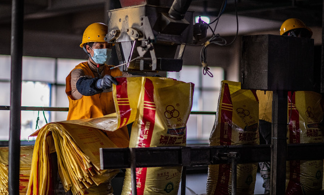 工人在云天化天安化工磷肥制造中心生產線進行袋裝操作。新華社記者 江文耀 攝