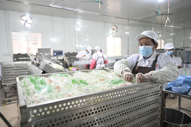 3月27日,在柳州市柳城縣社沖鄉柳州螺螄粉原材料基地里,工人在鵪鶉蛋加工廠車間里忙碌。