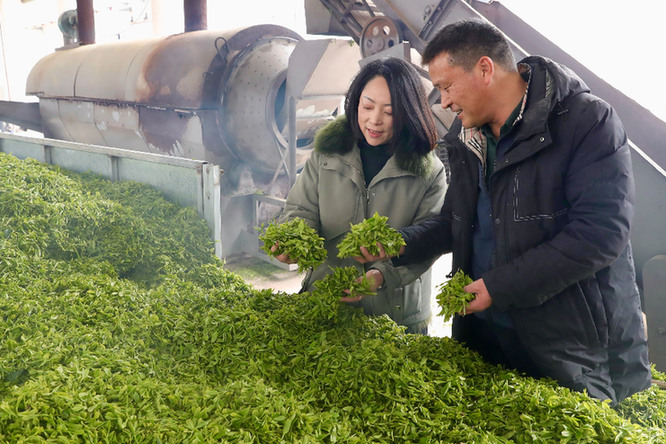 福建省連江縣長龍鎮一家制茶企業負責人在查看待加工的茶青(3月28日攝)。