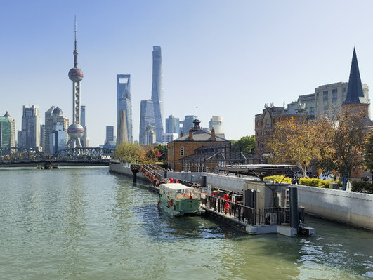 一艘蘇州河游船??吭谏虾M鉃┰创a頭。記者 陳愛平 攝
