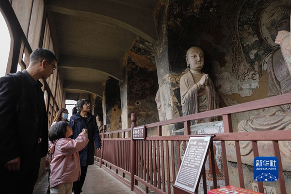 4月1日,游客在麥積山石窟參觀。新華社記者方欣 攝