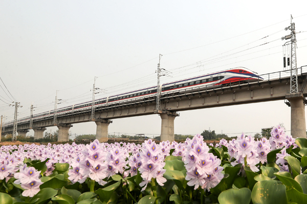 4月13日,從老撾萬象站駛出的D888次“瀾滄號”列車行駛在云南省西雙版納州境內的中老鐵路橄欖壩特大橋上。