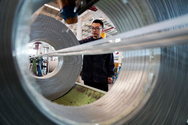 4月13日,唐山市一家線纜出口企業的工人在車間內工作。