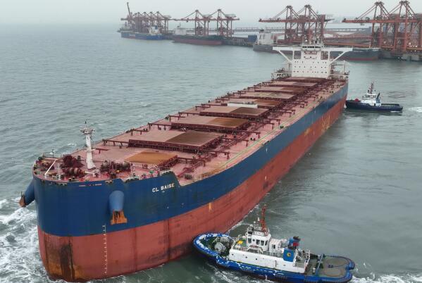 4月17日,一艘輪船在拖輪的協助下駛離唐山港曹妃甸港區礦石碼頭(無人機照片)。記者從河北省唐山市海洋口岸和港航管理局獲悉,今年1至3月份,河北港口集團唐山港完成貨物吞吐量20163萬噸,同比增長12.73%。新華社記者 楊世堯 攝