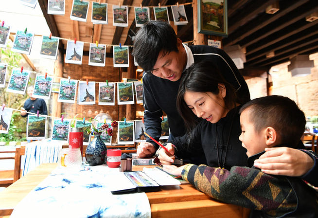 來自江西省吉安市的胡文亮是福建省寧德市屏南縣龍潭村引進的文創和專業設計人才。2020年5月,他投資六十多萬元翻新改造的兼具酒館、民宿和陶藝等功能的文創空間正式開業?!笆弧秉S金周期間接待游客近800人次。這是胡文亮(左一)和愛人曾婉珍(中)、小孩一起在繪制龍潭村主題明信片(2020年10月21日攝)。新華社記者 魏培全 攝